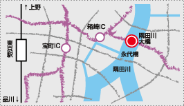 (5)JR東京駅丸の内口下車、都バスで錦糸町行き永代橋下車、隅田川に沿って隅田川大橋まで徒歩約5分。 |