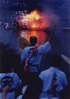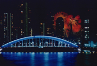 (1)吉村利雄様 (2)東京都中央区日本橋箱崎 隅田川大橋の上から (3)8月上旬(東京湾花火開催日確認のこと) (4)F16、バルブで30秒、花火は5・6発入れる。作品はベルビア100で撮影。