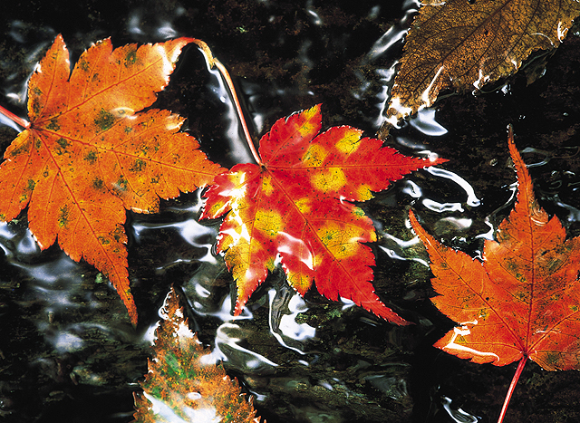 【蒔絵】湧き水に濡れた岩肌に、色々な種類の樹から落ちた葉がへばりついていた。漆の蒔絵を思い浮かべ、近寄ったり引いたりしながら構図を決めた。マクロ写真ではわずかなフレーミングの違いが作品の品格を決定する。PLフィルターを使わず、水の反射を生かしている。