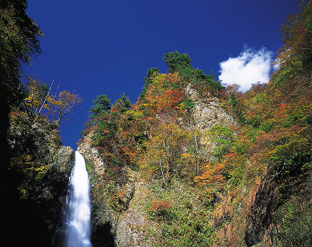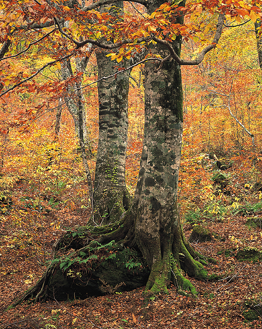 【ブナの原生林】世界遺産になっている白神山地の紅葉。屋久島に比べると明るい森だ。露出で言うと5段くらいの違いはあるだろうか。ブナの森は新緑もにぎやかで美しいが、紅葉は色とりどりのオレンジ色が楽しい。岳岱は人の少ない自然林だから、ゆっくりと撮れるおすすめポイント。この作品では岩を抱いたブナの老木のどっしりとした感じを撮りたかった。