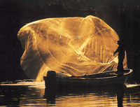 (1)島田浩様 (2)島根県簸川郡斐川町 新建川(宍戸湖に入る1kmほど手前) (3)12月中旬〜2月上旬 午前7〜9時頃 (4)年々投網する人(舟)が減っている。網の開き具合を見て上手な人を選ぶこと。三脚、高速撮影、300〜400mmレンズがあるとよい。