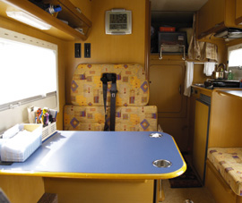 テーブル&ソファーが完備された車内。空いた時間にはパソコンで原稿を書いたり、DVDを観てリラックスできる。