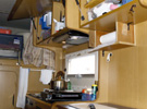 機能的なキッチンまわり。下には冷蔵庫、上部には調味料から洗剤まで。