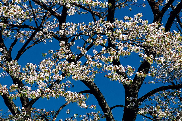 【山桜薫風】山桜が満開であった。この日は、見事とも言える春の一日で、空は青く澄み、春の空とも思えないような見事な快晴であった。その空を背景にして、満開に咲く山桜をクロ−ズアップしてみる。青い空と、白い花、太い幹、そして黄緑の若葉とが、美しい対比を見せてくれて、一枚の画面の中で完成度の高い構図を生み出してくれた。