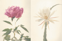 ファインダーから見ると、溢れる光の中に淡い色の花が浮かび、絵のように見えます。そのイメージをそのままに表現したいと思い、ポジを一度デジタルデータ化し、和紙へのデジタルプリントを試みています。(一部、デジタルカメラでの撮影も含まれています。)