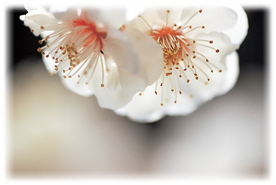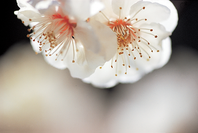 【ふたりのモノローグ】逆光方向からウメの二輪を接写している。バックの花を後ボケとして絵柄に取り入れ、画面に変化を与えている。