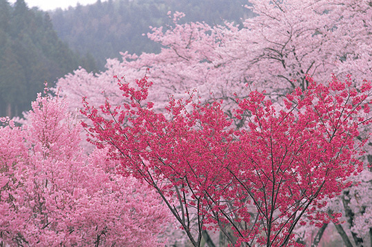 【競演】ソメイヨシノが満開で輝いていた。その前にはコヒガンザクラ、カンヒザクラなどが、ソメイヨシノに負けず劣らず、元気に花を咲かせて見事な花の競演をみせてくれていた。前景のカンヒザクラにピントを合わせ、背景にピンクのコヒガンザクラとやや白いソメイヨシノを配してフレ−ミングした。桜は種類によって色合いが異なる。その対比を捉えても面白い。