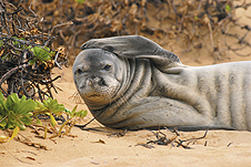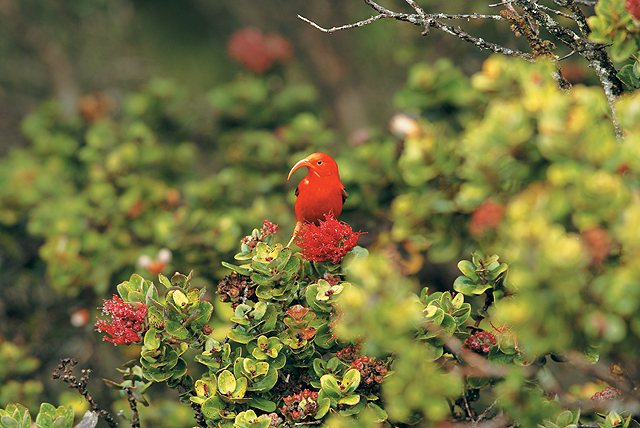 | 大変貴重な鳥の撮影に成功しました。“イイヴィ”という真っ赤な色をした鳥です。大きさはスズメを一回り大きくした程度ですが、ミツスイといって花の蜜を吸うためにくちばしが長く湾曲しています。ハワイ固有の鳥で、昔は王様のマントにイイヴィの羽が使われていました。今では大変珍しい鳥になっています。