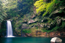 【静かな空間】落差もなく直瀑の単調な滝だが、大きく迫り出した新緑の楓、名水100選に選ばれた滝つぼに浮かぶ岩、屏風絵のような岩盤が一体となって日本画のような佇まいを見せてくれた。