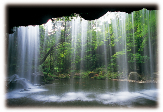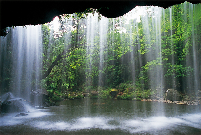 【涼景】滝裏にある広い洞から、レースのカーテン越に見る世界は心地よい自然の贈り物である。