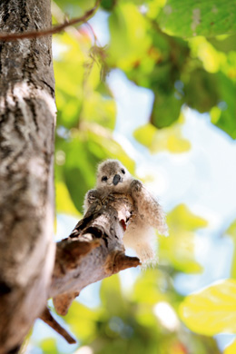 【うたたね】シロアジサシは、枝の分岐など、卵がかろうじて乗るところに卵を産みます。そこでヒナは孵り、しばらくそこで大きくなっていきます。落っこちそうな場所でうつらうつら、すごいバランス感覚です。