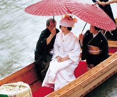 この地方は、周囲を水に囲まれた水郷地帯であったことから、この地域一体には水路(江間)が縦横に張りめぐらされ、嫁入りする際に花嫁や嫁入り道具を運搬するときにも舟が使われており、昭和30年前半ごろまでは日常的に行われていました。毎年6月に開催される「あやめ祭り」では、紫・白・黄と色とりどりのあやめが咲き乱れる中を、復活した「嫁入舟」のイベントが行なわれ、今では水郷潮来を代表する行事となりました。