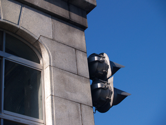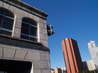 信号機の部分を大胆に切り取ることで造形の面白さを表現。壁面と青空とのコントラストも強調されます。