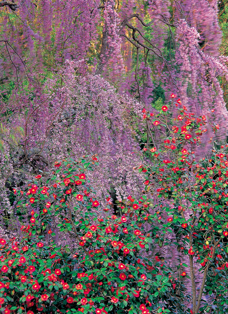 【競演】満開の枝垂れ桜の手前に、ツバキが花を咲かせている。被写体から離れた場所で、望遠レンズを使うことによって、桜とツバキとの距離を近くすることができる。望遠レンズの特徴を活かし、お互いの美しさを引き出した作品である。