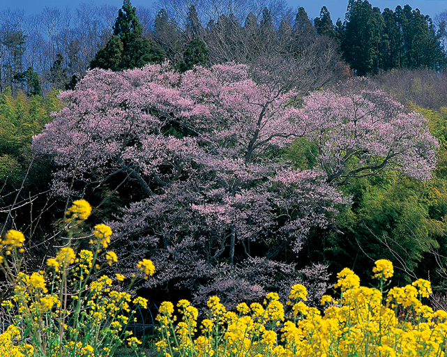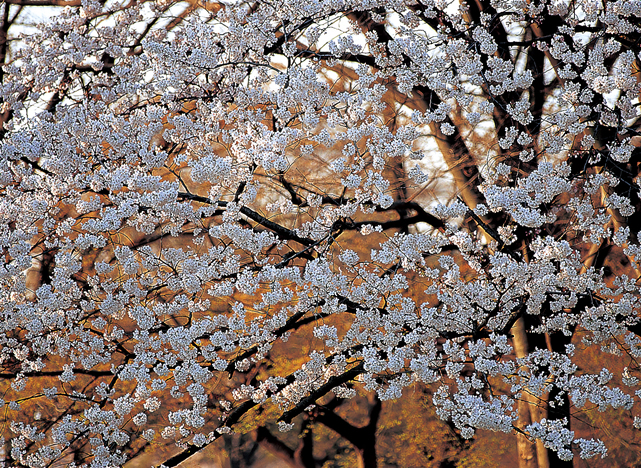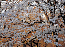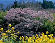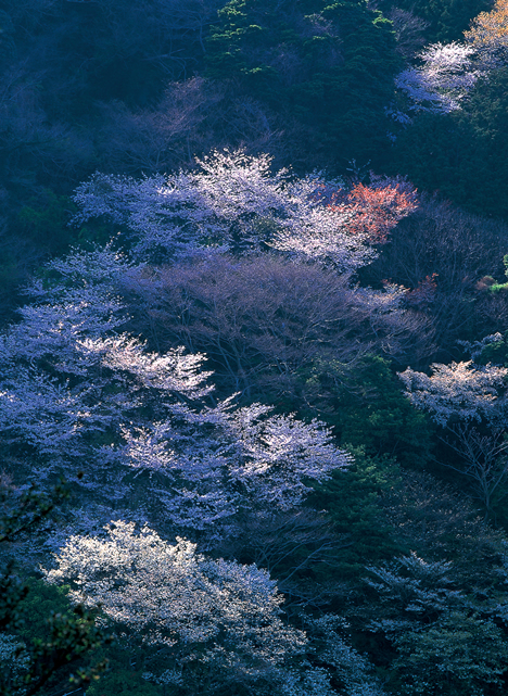 【桜群舞】多くの山桜が咲き乱れている。この自生している桜群落を眺めていると、日本のもっている自然の美しさにため息が出る。山桜がお互いの間隔を保って力を寄せ合って咲いている姿が、なんとも美しく魅力的である。