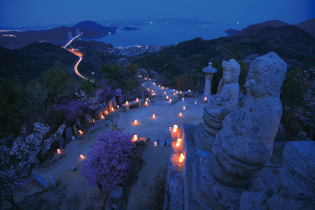頂上の展望台からは向島との間に架かる因島大橋をはじめ、島々の間を行き交う船などが見下ろせる360度のパノラマが広がります。春の桜、秋の紅葉と五百羅漢の石仏のコントラストは見事です。