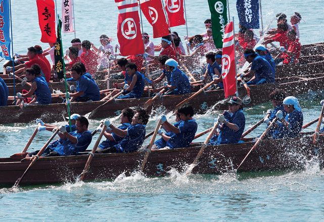 “因島水軍まつり”は村上水軍の本拠地となっていたことに因んで、因島地域の人が総出で盛り上げる3部構成のイベントです。その中のひとつ“海まつり”は毎年8月の最終日曜日に、村上水軍が伝令船として使用した木造船「小早(こはや)」による競争レースが行われます。