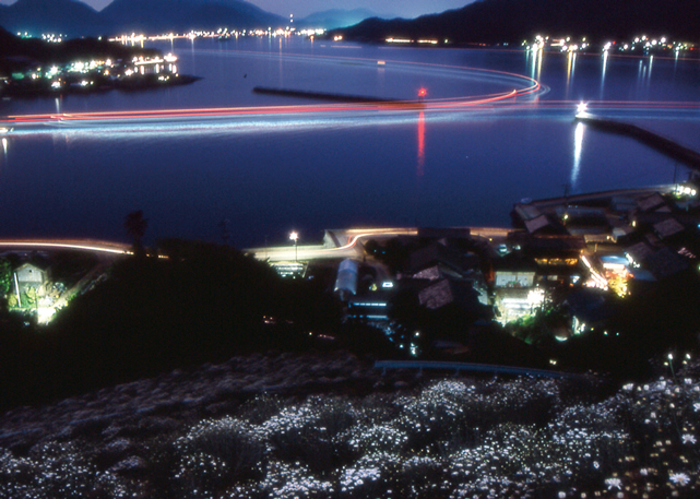 その他、“島まつり”は水軍城で出陣式の後、村上水軍の菩提寺である金蓮寺で先人感謝祭を行い、土生港周辺でパレードや跳楽舞(ちょうらくまい)を踊ります。また、“火まつり”は火に照らされた夜の海辺砂浜に、水軍跳楽舞、鎧冑武者が集結。因島村上水軍陣太鼓の演奏や大松明の練りまわしがあり、クライマックスに花火が打ち上がります。 |
