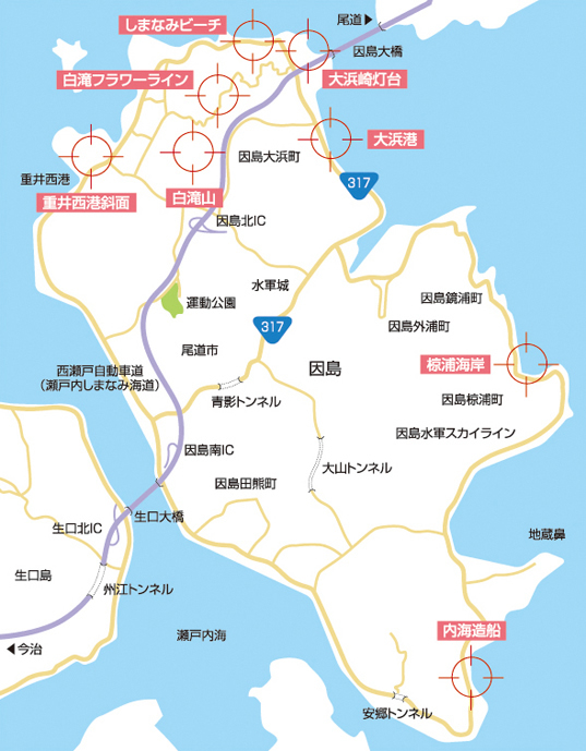 広島県尾道市と愛媛県今治市を結ぶ西瀬戸自動車道・通称“しまなみ街道”は、瀬戸内海に浮かぶ芸予諸島の6つの島をつないでいる本州四国連絡道路のひとつです。尾道から2つ目の島・因島は、室町時代から戦国時代にかけて勇名をはせた村上水軍発祥の地です。近年では造船の町として一時代を築き上げました。