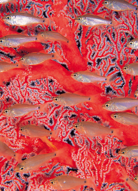 【オオイソバナとクロホシイシモチ】腔腸動物のオオイソバナが、白いポリプを全開にして、微少なプランクトンを待ち受けている。クロホシイチモチは木陰で休むかのようにじっとしている。