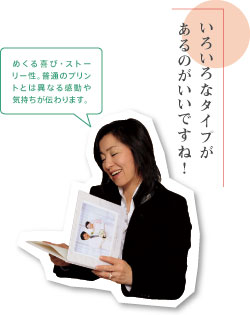 「フォトブックはビギナーの方でも気軽に楽しめるコンパクトタイプから、大きなサイズの本格写真集でハイアマチュアも満足できるものまでラインナップが揃っています。まずは店頭にある見本を実際に手にとって、その魅力を知ってもらいたいですね。価格もこれまでの写真集を作るのに比べたらはるかに安く、お買い得なオリジナル写真集が誰にでもつくることができます」。