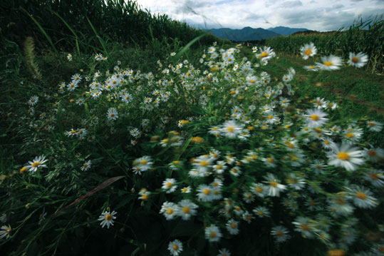 【白い野菊】ワイドレンズを使い、絞りを絞り込み奥行きと距離感を出して撮影した。花は風で揺れたが、その方が写真に強さが出て効果的である。