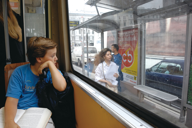 ウィーンの街を走る路面電車で向かいに座った少年。熱心に読書をしながらも外が気になった、その瞬間。スナップには広角レンズが適している。