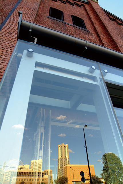 「I Love ランドマーク」/みなとみらい21 赤れんが倉庫のレストランのウインドウに写りこんでいる横浜ランドマークタワー。