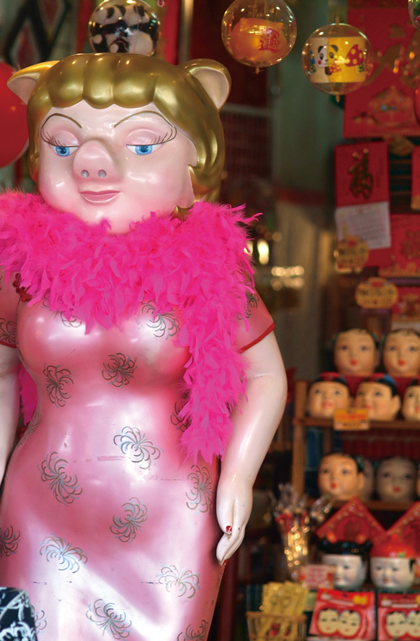 中華街に並ぶおみやげ屋さんの店先に飾られたチャイナドレスをまとった人形。 |