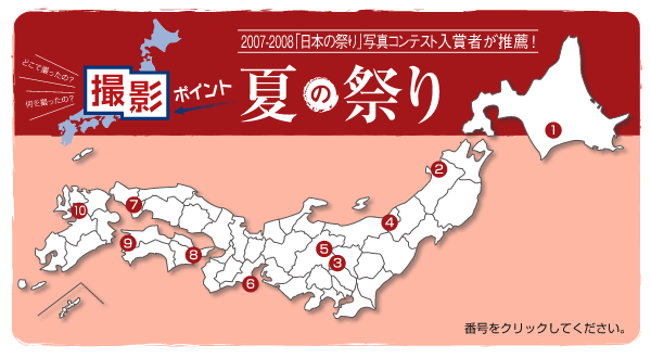 「撮影ポイントが知りたい」というお客さまの声にお応えするコーナーです。今回のテーマは夏の「風景」と「祭り」。撮影ポイントと写真、そして撮影アドバイスはコンテスト入賞者の方々にご協力いただきました。ぜひご活用ください。
