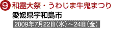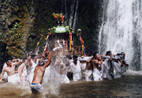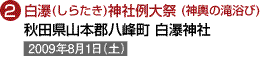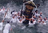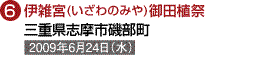 (1)坂巻宏枝様 (2)ペンタックス67 (3)165 (4)f5.6半 (5)1/125 (6)フジクロームベルビア (8)三重県志摩市磯部町 (9)2007年6月24日 正午頃 (10)この祭りは田植え装束の若い男女が早苗を取る儀式や、団扇を倒して奪い合う竹取り神事など、午前11時頃より午後5時頃まで撮影に事欠かない題材が多数あるので、自分なりのしっかりした目標を持つ必要がある。 (11)近鉄志摩線上之郷駅から徒歩約5分で社頭。 (12)志摩市観光協会 TEL.0599-46-0570 |