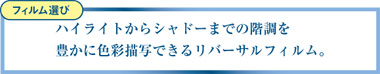 今、写真界はデジタルカメラ全盛の時代。カメラメーカーはもちろん、カメラ書籍もデジタル一色。しかし、そんな中でも銀塩写真にこだわり続けている方も数多くいます。中でもリバーサルフィルムの人気は根強く、その最大の理由が“色の階調再現の豊かさ”です。すなわち“微妙なグラデーションと明解なコントラスト”。このことはプロ・アマチュアの区別なく支持されています。今回、代表的なリバーサルフィルムの特性についてリポートいたします。