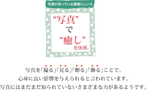 写真を楽しむことが脳にさまざまな刺激を与え、脳の活性化に役立っていると考えられています。写真を「撮る」「見る」「贈る」「飾る」それぞれの場面で人を癒したり元気づけるなど、心身にいい影響を与えると言われています。このことは実験データからも実証されています。
