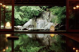 手前は部屋の中のお風呂で、その外が露天風呂になっています。人工物と自然の調和がバランスよく取れているところで、造った人の感性が現れている場所のひとつです。温泉の軟らかいお湯と周りの自然が一体になる感じを意識して撮影。