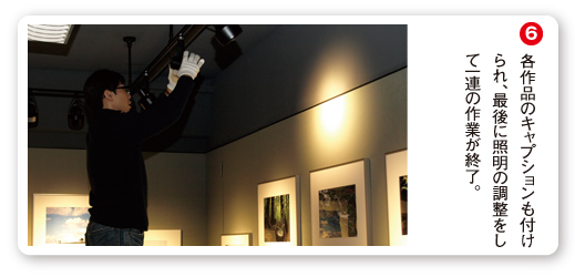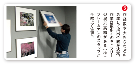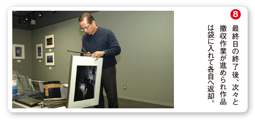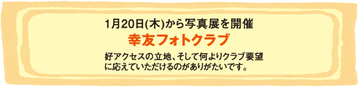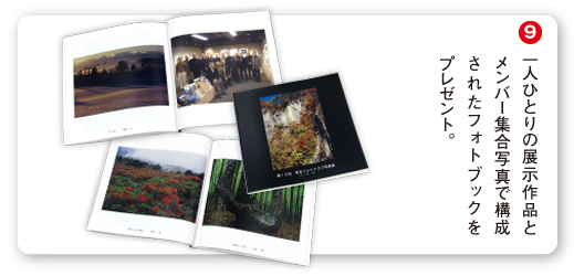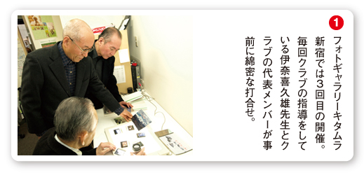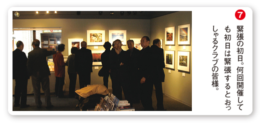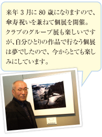 ここでの開催は3回目になります。毎回クラブの要望にいろいろと応えてもらってとても助かっています。それと何よりもアクセスがいいです。いつも数多くの方に我々の作品を見に来ていただいていますので、今回は定休日の日曜日も営業していただきました。クラブの写真展としては16回を数えますが、グループ展のいいところは一人ひとりの負担が少なくて済み、それでいて本格的な写真展が体験できることではないでしょうか。いきなり個展を開催するよりも、グループ展を何回か行なってから個展を開催するといいと思います。 |