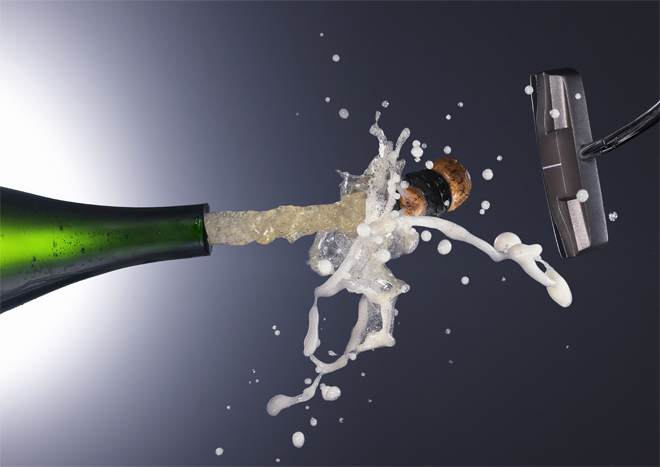 ポン! 空いた瞬間、勢いよく飛び散る白い泡。瓶の口に挟まったまま、宙を舞うコルク。脈々と伝わってくる生命感に、喝采の拍手が聞こえてこないだろうか。「進水式」といわれる、新しい船の門出を祝う儀式がテーマ。アメリカのゴルフ雑誌の新年号用として撮影をした。未知なる未来への期待、そして高揚感を祝杯する瞬間である。