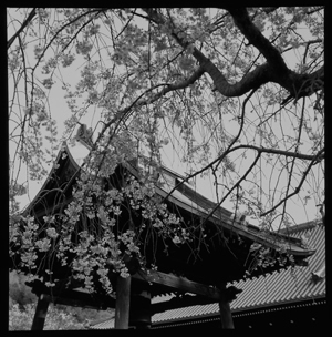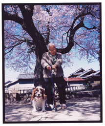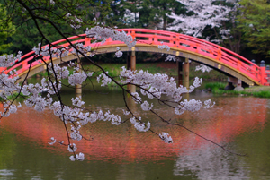 称名寺境内の池に咲いた桜と真っ赤な橋のコントラストをとらえた作品