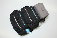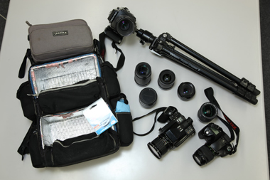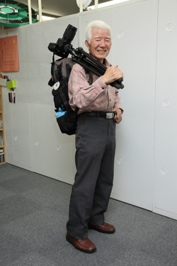 何でも自作してしまう門出さん。なんと、リュックもすべて手づくり。レンズ用のソフトケース生地をつなぎ合わせたアイディアもので、うっかりファスナーを閉め忘れても中身が落ちない構造になっています。他の機材を入れた別のポーチも取り付け可能。なんとも欲しくなる一品ですが、残念ながら非売品です。