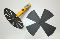 「さて、これはなんでしょう?」といいながら、電動のねじ回しに、黒いプロペラを取り付けた門出さん。スイッチを入れると、羽根がまわりはじめました。携帯用扇風機ではありません。正解は、長時間露光で車の光跡を破線に見せるためのアクセサリー。その効果は作品をご覧ください。