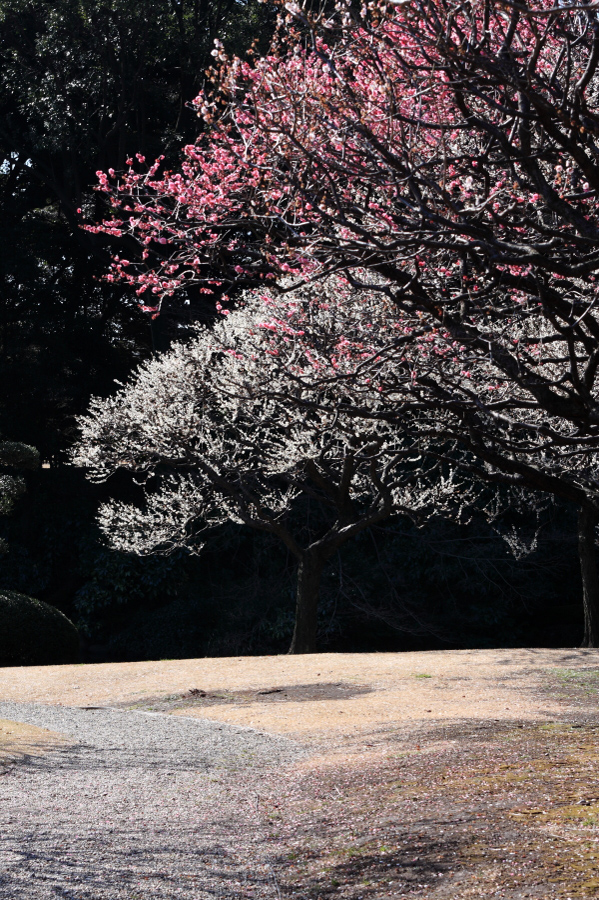 背景に青空を持ってくるか、黒い枝で背景をぼかすか悩むところですが、印象が大きく変化する背景選びも結局は梅の色で写真の印象が左右されるので、どちらが正しいということはありません。そのときに大切なのはあくまで梅本来の色がキチンと表現できるか、細かい露出の調整を繰り返して複数撮影するということです。晴れの日であれば+側の露出補正がオススメです。また、WBだけでなくプリセットのカラーバランス調整(キヤノンであればピクチャースタイルのこと)を変更することも忘れずに撮影しておきましょう。