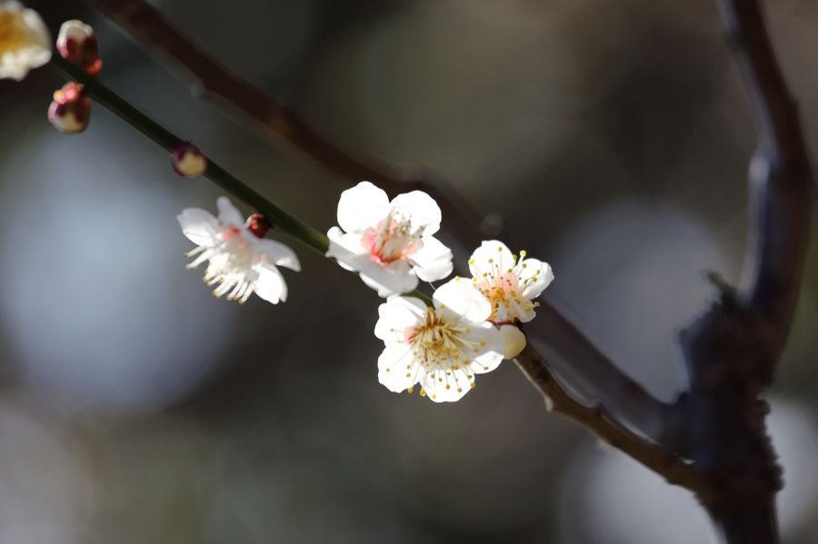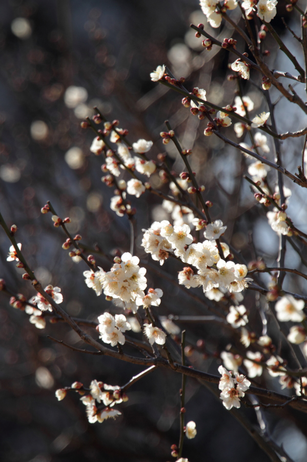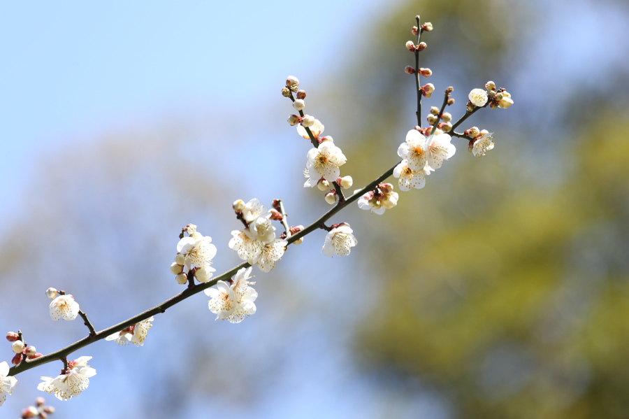 まずはたくさんの枝が入り込んでいる画面よりはシンプルに数個の梅が枝についているものを初めは狙うといいでしょう。そして絞りをなるべく開けて撮影し背景をボカせばOKです。マクロレンズで極端に寄るという方法もよくありますが、望遠ズームが一本あれば大体撮影可能です。70-200mm、欲を言えば300mm相当の望遠で最短撮影距離で撮影できれば簡単に背景をぼかして撮影できます。広角で梅林全体を狙ってもいいのですが、もともと小さい花ですので、満開の時期でない限りは広い景色だと梅の印象は弱くなりがちです。