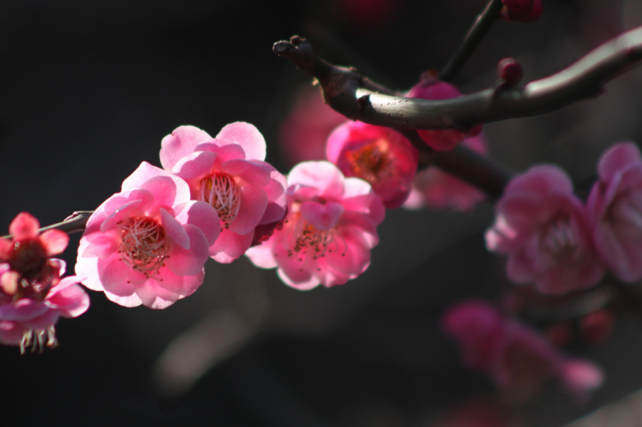 そして2月下旬から3月上旬の日中12時頃のライティングであれば、カメラの種類によって若干の色再現が異なりますので一概には言えませんがホワイトバランスを太陽光に設定するよりもオートWBに設定して撮影したほうが、本来の梅の色が表現されるようです。順光、逆光どちらの光でも撮影は行えますが、スタンダードなのは順光での撮影です。小さい花になると逆光気味で撮影するとどうしてもコントラストがつきすぎるイメージになりがちです。もし逆光で撮影するなら、梅がシルエット気味にならないように斜光、半逆光になるよう梅との位置を考えてアプローチします。