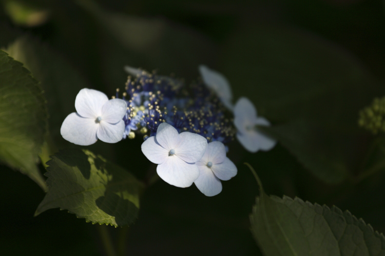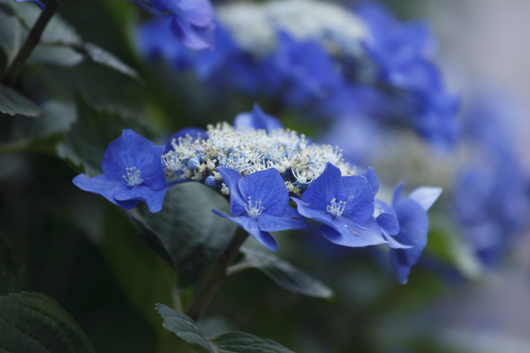 もちろんボケを生かした撮影も面白いでしょう。ガクアジサイのように花の真ん中にしべのような部分が密集し周囲に小さな花が咲いています。周辺の花にピントを合わせれば密集した中央のしべの部分がボヤけて一体となり小さな花の部分が引き立ちます。また、緑の葉っぱを入れることで淡い色との色彩の差を見せることも可能です。花よりは葉っぱのほうが全体的に盛り上がって中に埋もれてしまうアジサイもありますが、ライティングによってはスポットライトのようにアジサイだけが照らされていることもよく目にします。たくさん咲いている中でも細かく観察していけばバリエーションをつけた撮影ができるのがアジサイの特徴でもあります。あと少しの時期ですが、道端で手軽に撮影できるアジサイの撮影にチャレンジして見てはいかがでしょう。