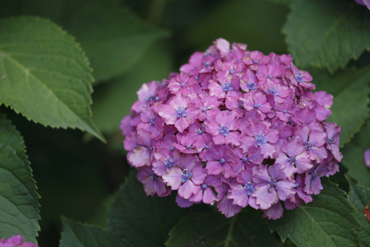 撮影時に注意したいのがピント位置で、小さな花や花びらが密集して一つの形を作っている花ですので、マクロなどで極端に寄ってしまうと、前後が大きくボケてしまいアジサイ全体として捉えることができません。ひとかたまりで見れば比較的大きな花ですので、その際はマクロレンズで寄らずにやや広角気味で花に寄って大きく見せるのも一つの手段です。また望遠レンズを使いその最短撮影距離(およそ1.3m~1.5m程度)で一つのアジサイをポイントに撮影するのもいいでしょう。