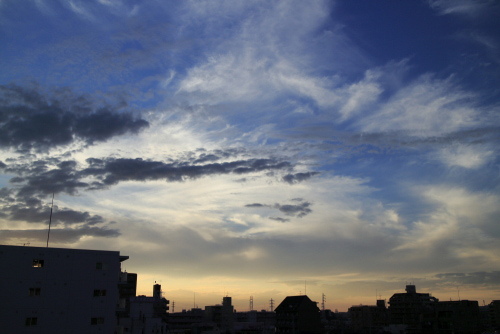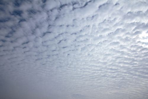 露出は夕方や朝方の場合、若干アンダーにしてコントラストをつけると雲の様子がはっきりでて立体的になります。ただし、朝焼け夕焼けの色も同時に濃く出てしまいます。また、晴れている日中はプラス側に補正しておきます。補正無しだとどうしても写真は暗くなってしまいます。薄い雲と明るい空との微妙なグラデーションが撮影時でだけでは上手く再現できない場合はPC上での画像処理も必要です。ただし彩度や色の濃さなどのパラメーターを調整しすぎる(動かしすぎる)と、単純に派手な印象の空模様になってしまいますので注意します。明るいところと暗いところの差「コントラスト」の調整や明るさ補正だけで多くの場合は解決できます。