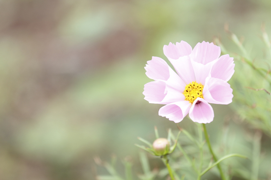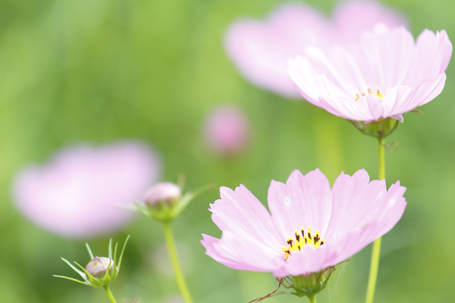 早い場所では8月下旬、おもに9月から10月末頃までで見頃を迎える秋の花にコスモスがあります。ピンク、白、黄色、オレンジといった鮮やかな色を持つ小さなコスモスが辺り一面に咲いている情景は見事です。ただしそれを撮影する際、単純にワイドで狙うだけでは少し物足りません。花びらの形がなるべくきれいなものを選び、まずは単体で狙ってみましょう。それから、背景、もしくは前をぼかすための花を探していきます。一つの画面に複数の細々したコスモスがちりばめられるよりはシンプルな画面にまとめたほうが被写体は浮かび上がります。180mm程度の望遠マクロを使えば比較的離れた位置からコスモスにアプローチできるので便利です。
