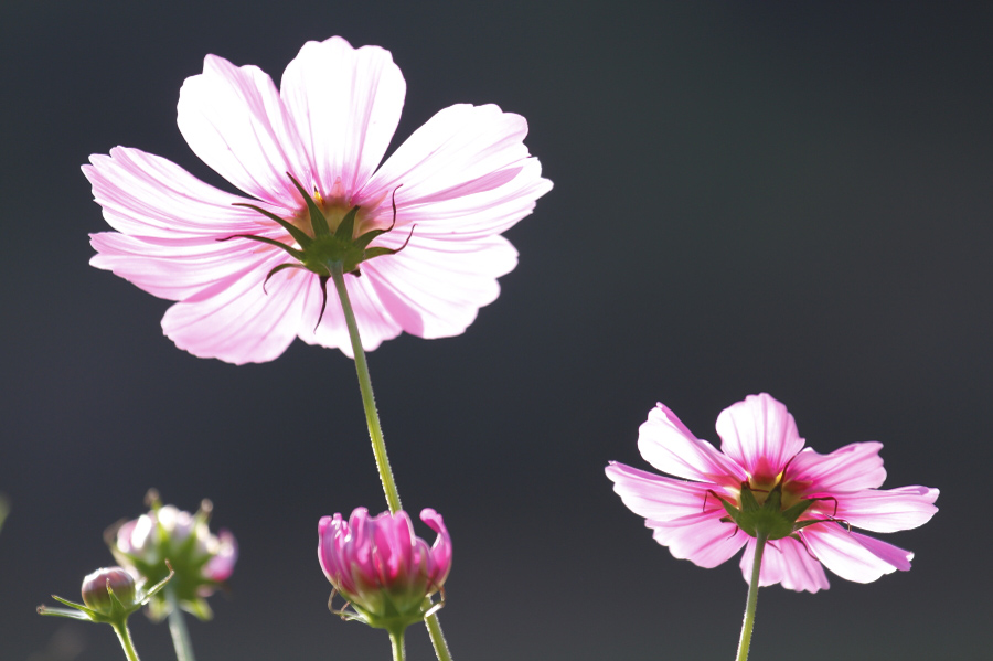 コスモスは密集したり高さがまちまちに咲くことが多いので、ある程度の撮影距離がある方が撮影は楽に行えます。大きいものでも直径10cm程度のお花ですので大きく撮影するためにマクロや200mm程度の望遠レンズが必要となるわけです。太陽の位置は順光、逆光どちらでも効果的に撮影できます。ただし、あまり光が強くあたる順光では花びらの影が出たりしてコントラストの強い写真になりがちです。特にピンクのコスモスは光の強くない薄曇りの際に撮影すると、きれいな淡いグラデーションが表現できます。順光だとどうしてもコントラストがついて色は濃く出てしまいます。