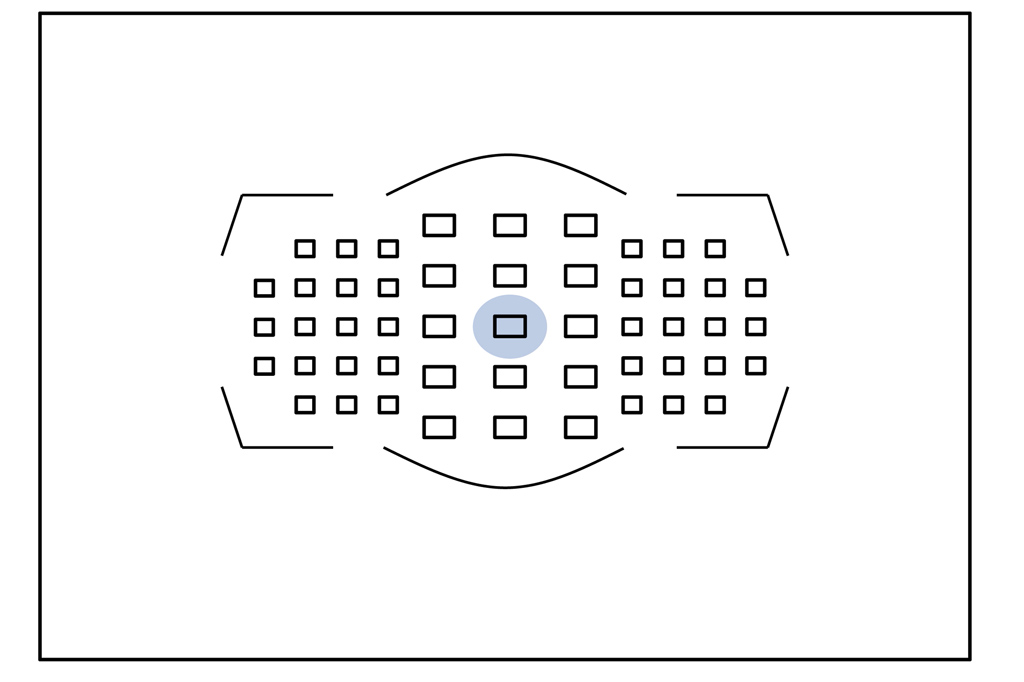 ただし、数多くある測距点そのすべての精度が一律かといえばそうではありません。AF精度というのは、素早く正確にというだけでなく、暗いシチュエーションや明暗差の少ないシーンに対して、いかにピントを合わせてくれるかという点も含まれます。カタログなどで「クロスセンサー」という表記がされるカメラがありますが、縦横にAFセンサーを配置することで、ピント検出精度を高めているクロスセンサーは中心部、及びその周辺の測距点に使われていますので、結果周辺部の測距点よりは中心部のほうがAF精度は高くなります。