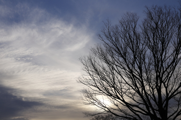 落ち葉だけでなく、どんぐりや枯れ草などもまた冬を象徴してくれます。寒さを出すために、薄曇のライティングも有効ですが、3時から4時ごろの影が長くなる斜めからのライティングと合わせて撮影すると温かみが感じられる写真になってくれます。冬場に斜めのライティングとなる午前10時ごろと午後3時ごろの色温度は近く、そのとき落葉の赤みや黄色を演出したいのであれば、WBを太陽光より少し高めの6000Kあたりに設定するといいでしょう。また大きな葉の落ちた立ち木も公園でよく見かける光景です。夕方4時過ぎから陽が傾いて薄暗くなる時間帯、空をバックにシルエットで狙うと冬の寒空を感じさせた写真になってくれます。