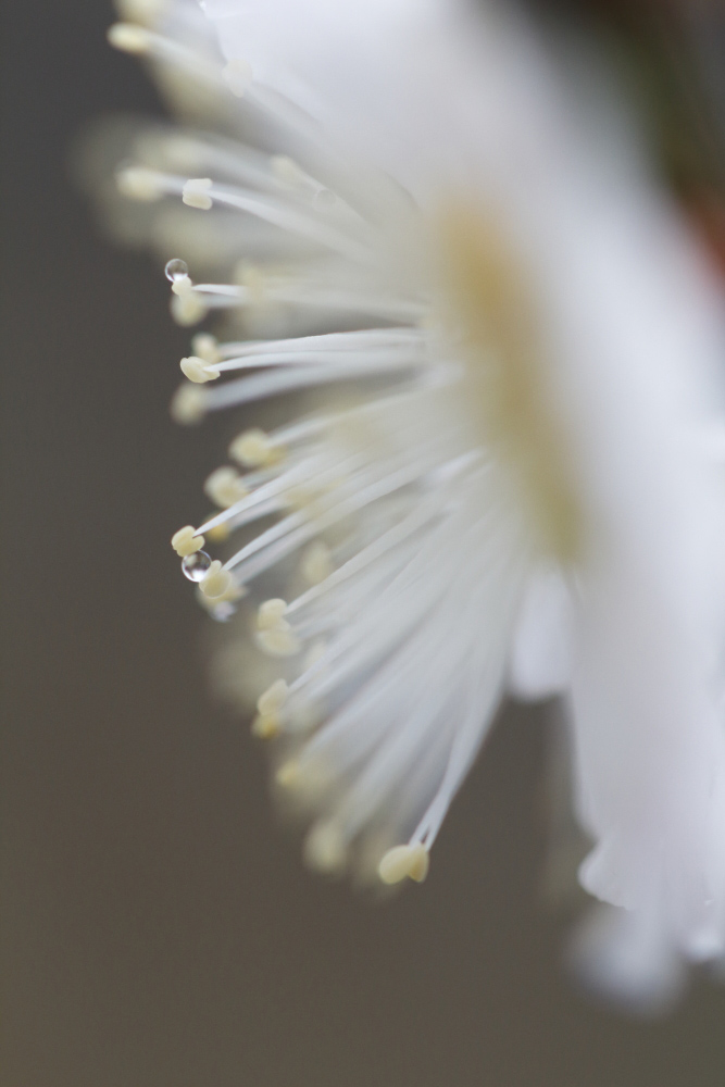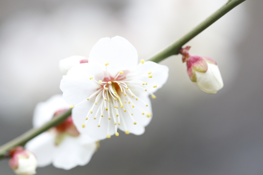 話しはそれましたが、曇りの天気のおかげで梅に強い影が出ずにマクロで撮影し+補正を行うことで柔らかい雰囲気を演出することができました。背景に空をもってくるとどうしても白く飛んでしまいがちですので、暗めの背景や色の付いた梅を後ろに配置するなど工夫してみましょう。梅についた水滴なども雨の日ならではの写真になります。作例の露出はマルチパターン測光で+1程度、WBはオート、ピクチャースタイルはスタンダード、使用レンズは100mmF2.8マクロレンズ、絞りは開放から背景のボケを確認してF4で撮影したものもあります。マクロでの撮影は必ず開放ということでもなく、ボケの大きさやエッジの立ち方などで適宜絞りを変えておくとボケ味が均一にならず作品にアクセントが付きます。花がたくさん咲く季節。まずは梅の撮影を楽しんでみてはどうでしょう。